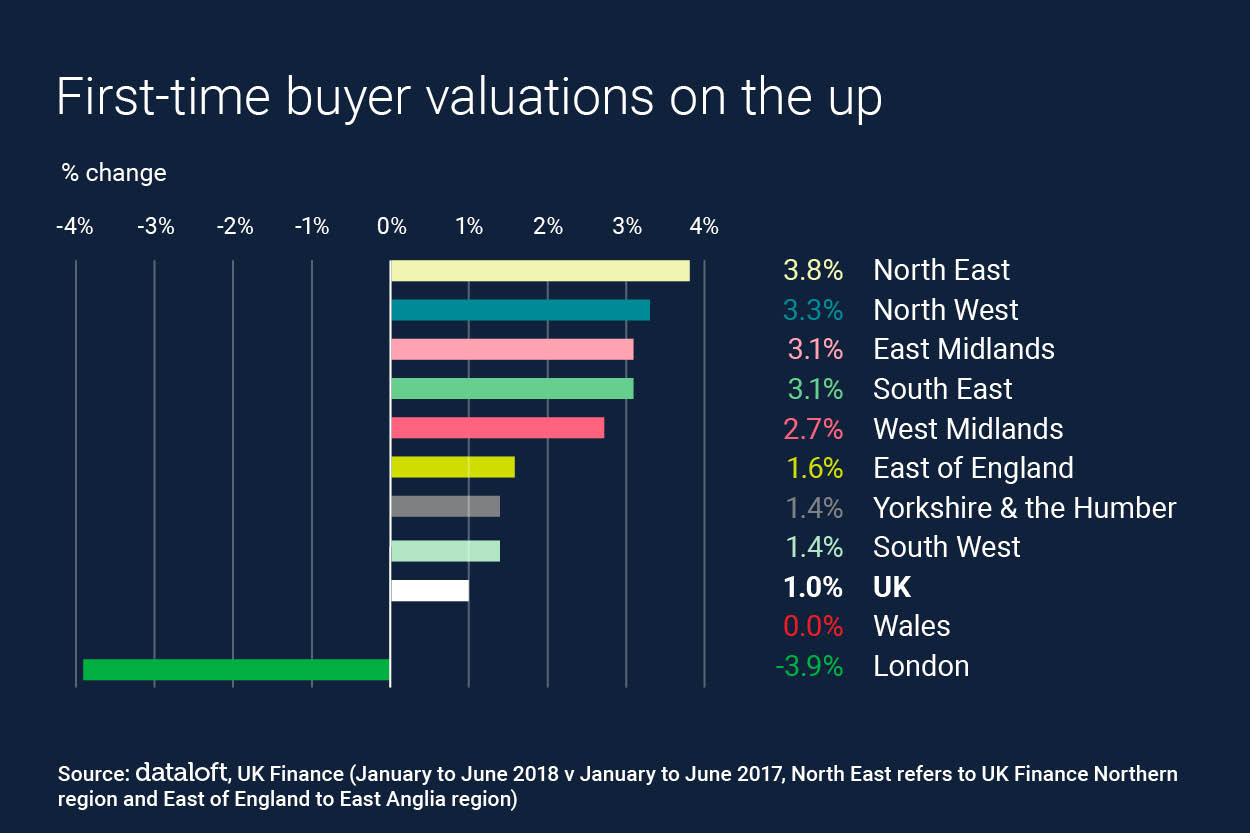 The number of property valuations for first-time buyers has risen in all areas of the UK except for London, according to the latest data released this week by UK Finance. The largest increases in first-time buyer valuations were in the north of the country, where over 43% of first-time valuations are for properties priced less than £125,000.