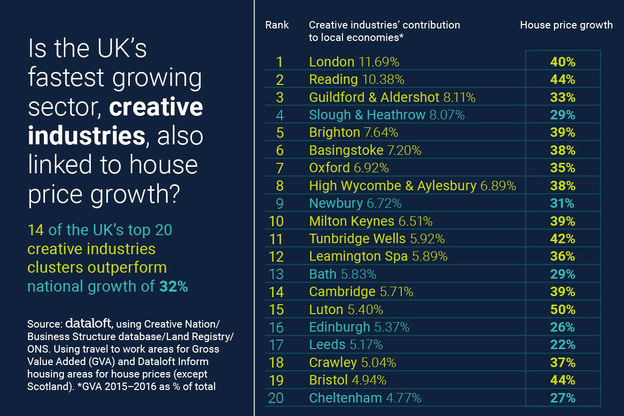 - Providing 1 in 11 jobs and growing at double the UK average rate of job creation, the sector has an important role to play in local employment, housing markets and regeneration. We have ranked the clusters based on the proportion of gross value added (GVA) creative industries contribute to the local economy and then looked at house price growth in those locations over the past year and last five years.