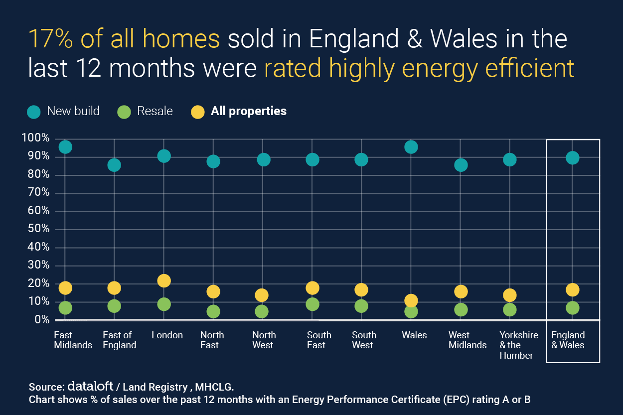 - With energy efficiency a requirement in the building of new build homes, nine in every ten new build properties hit the grade, while the figure is just one in 14 for resale properties.