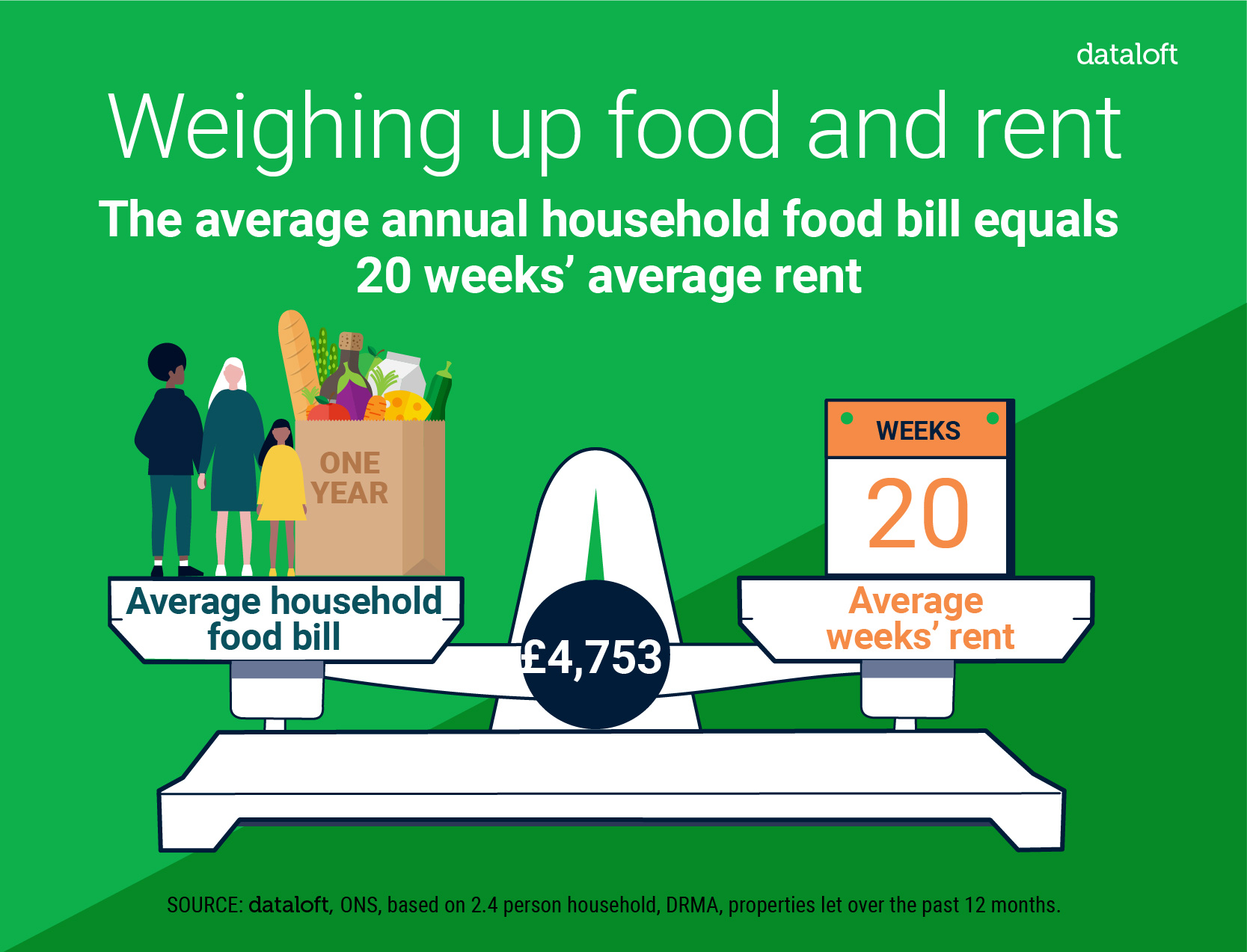 £4,753 is the total amount an average household spends on food and non-alcoholic drinks per year, the equivalent to 20 weeks’ average rent.