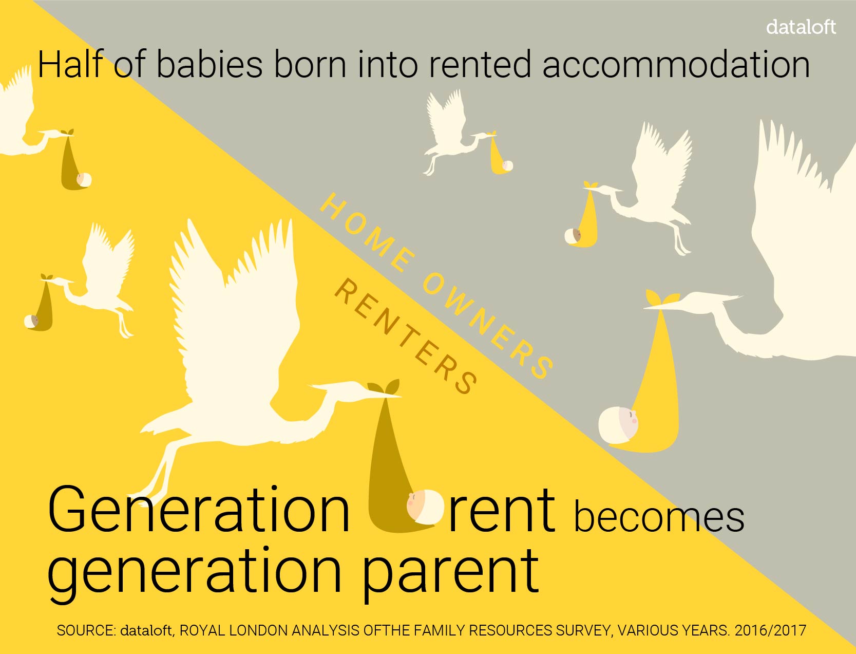 - Nearly half (49.2%) of all babies were born into rented homes in 2016/17, according to a new report by Royal London, up from just one in three in 2003/04.
