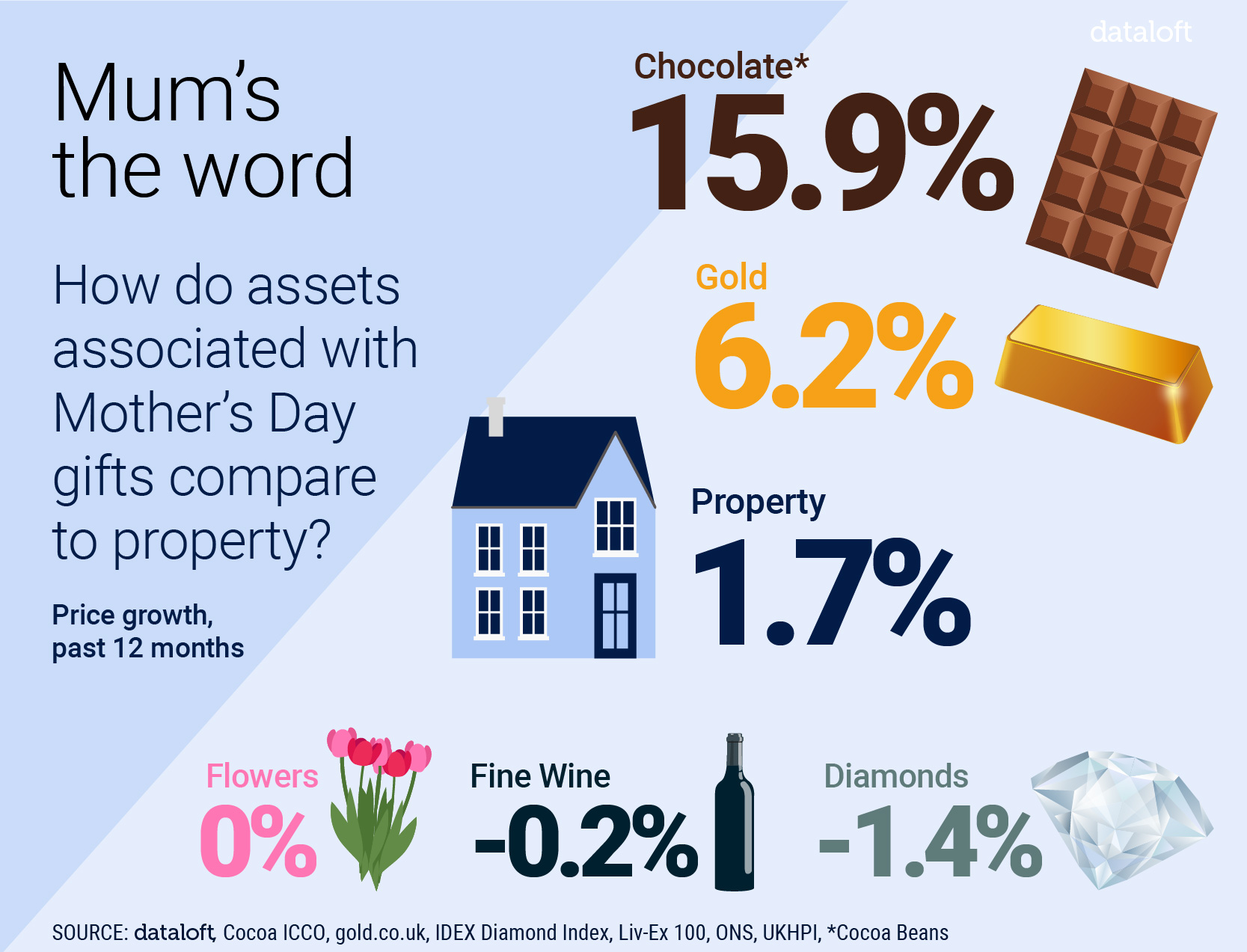 - For those who want to splash out on mum, how have values for other asset types fared? Over the past year the price of cocoa beans, the key ingredient for chocolates, has risen by 15.9% while gold is up by 6.2%.