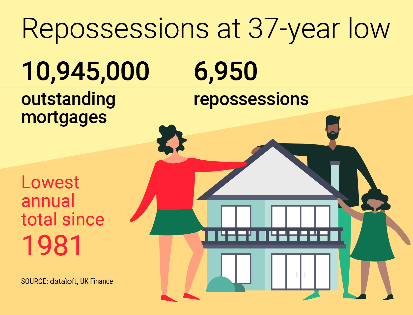 - Just 6,950 homes were repossessed during 2018, the equivalent of just 0.06% of all homes with an outstanding mortgage. Repossessions are at their lowest level since 1981, with nearly 700 fewer properties repossessed than in 2017.