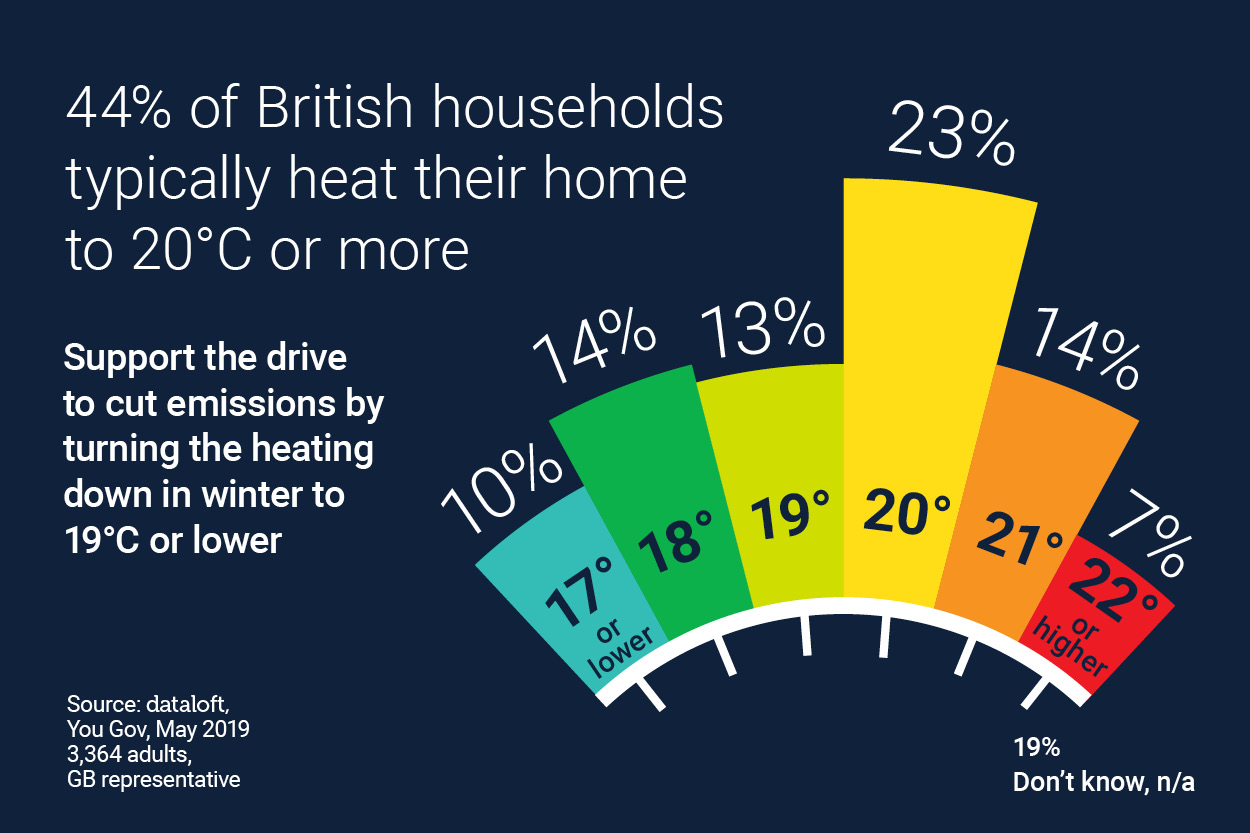 - A survey conducted this month by You Gov found that 44% of British households typically heated their home to 20 degrees or more, with a further 27% heating to between 18 and 19 degrees.
