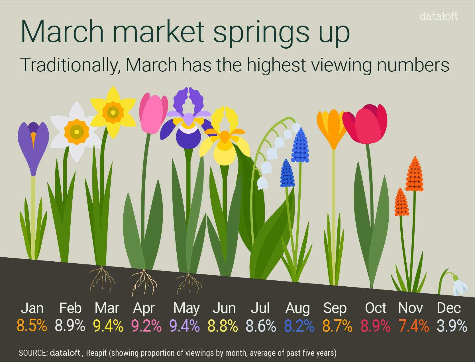 On average, over the past five years, March has been the busiest month of the year for property viewings, with May and then April following in second and third place.
