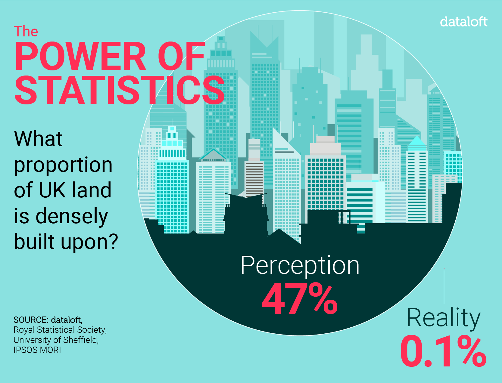 Only 0.1% of UK land is densely built upon – a statistic that took many people by surprise. In a poll conducted by IPSOS MORI earlier this year, the public hugely overestimated the figure, with a mean guess of 47%.
