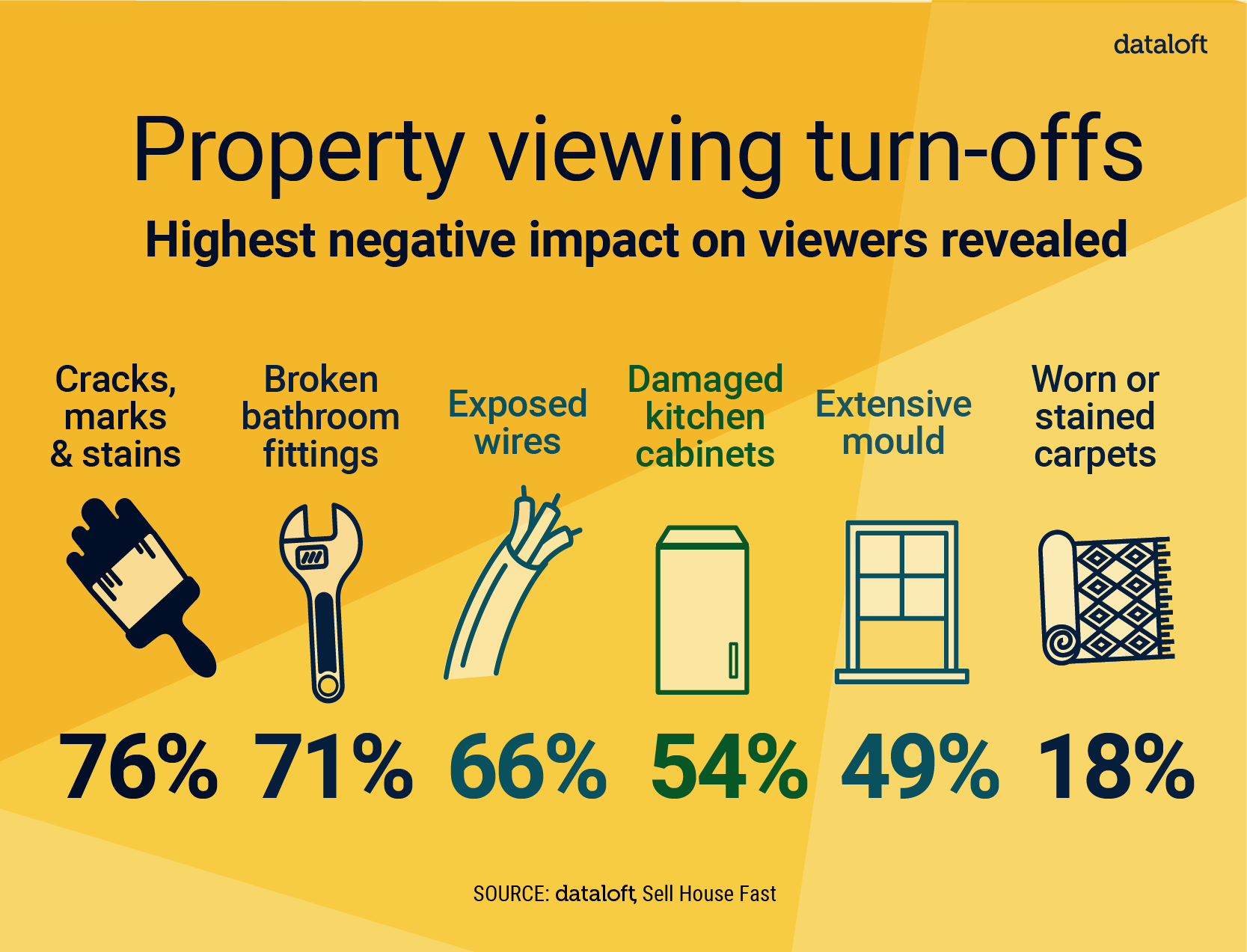 • Cracks, marks and stains leave the biggest negative impression on prospective buyers during a viewing, with a 76% turn-off rate. This is according to Sell House Fast who surveyed 1,266 people who have been to several viewings over the last year.