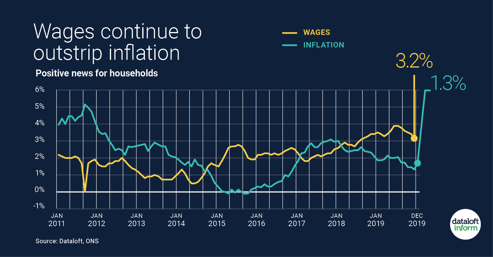 The latest data from the ONS (Office for National Statistics) indicates that at 3.2% wage growth continues to outpace inflation, positive news for household finances.